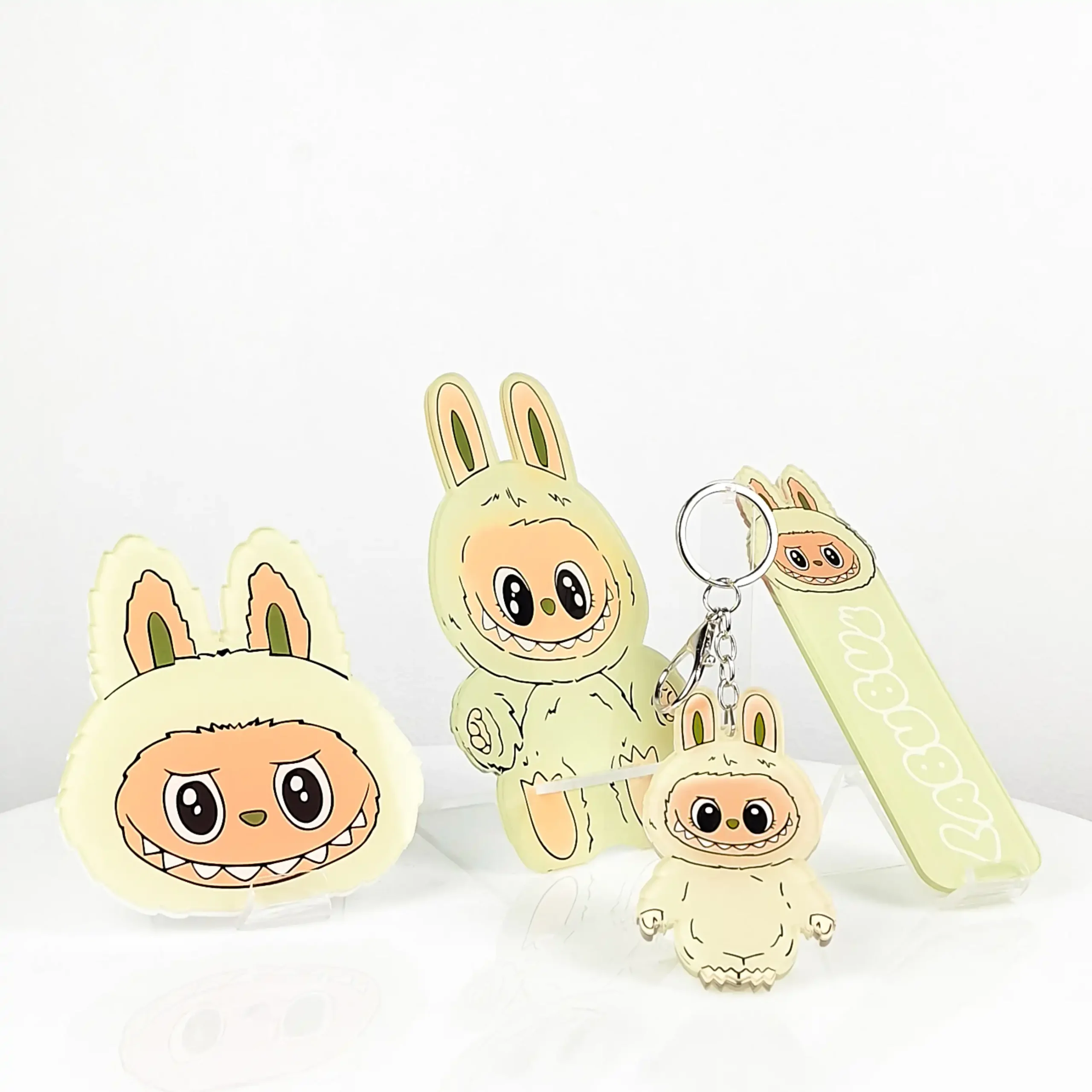 Discover the charm of Labubu with this premium acrylic set! Includes a mobile holder, bag keychain, bookmark, and coaster — all crafted from high-quality acrylic with vibrant, lasting designs. Perfect for daily use or as a unique gift.