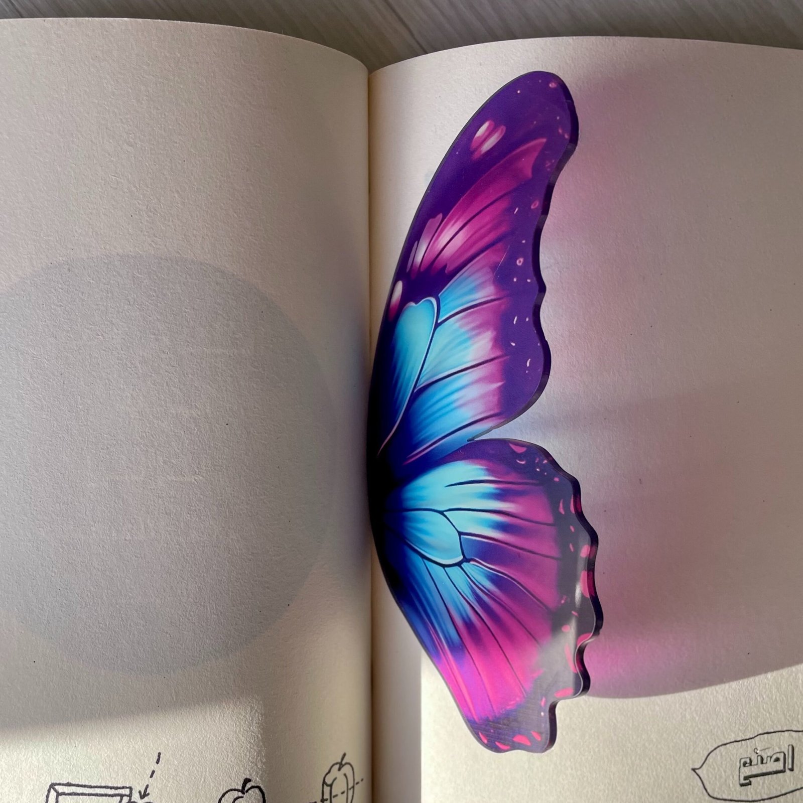 Vivid violet butterfly wing bookmark with blue edges for a fantasy vibe.